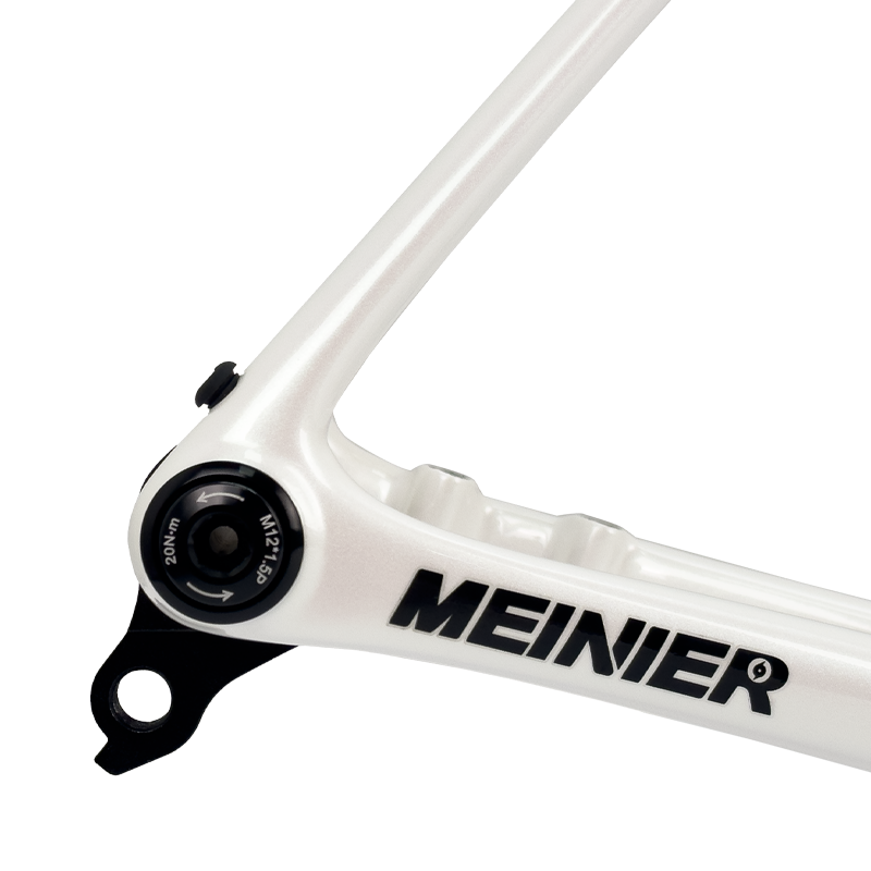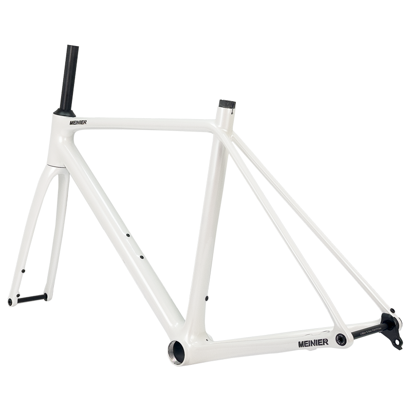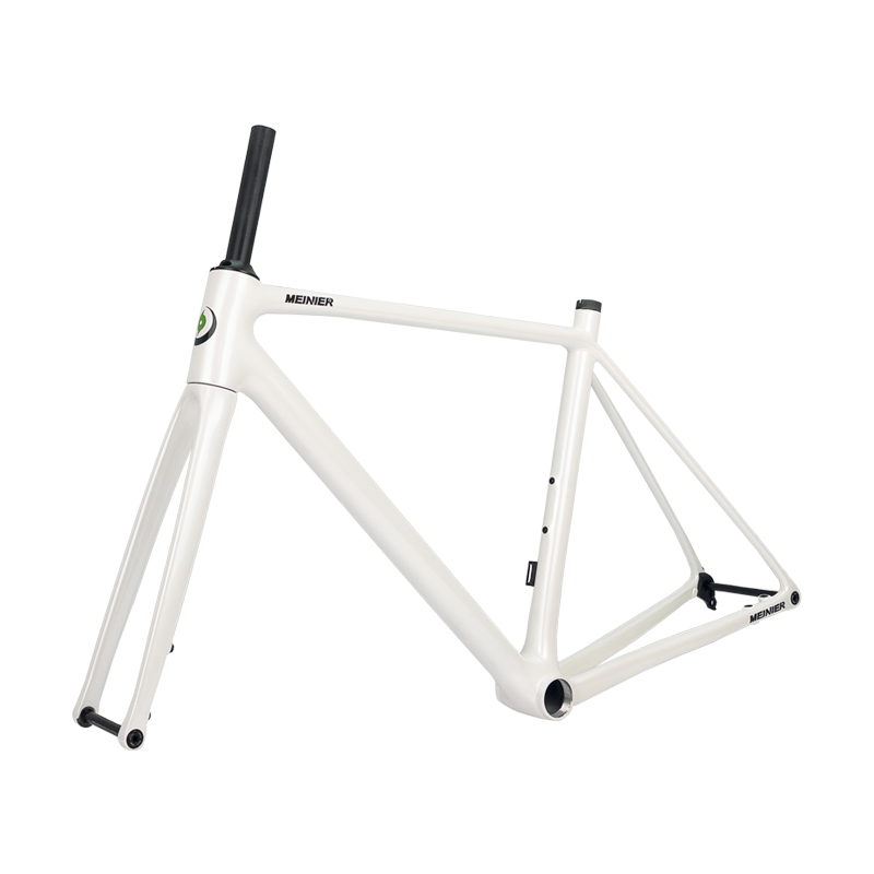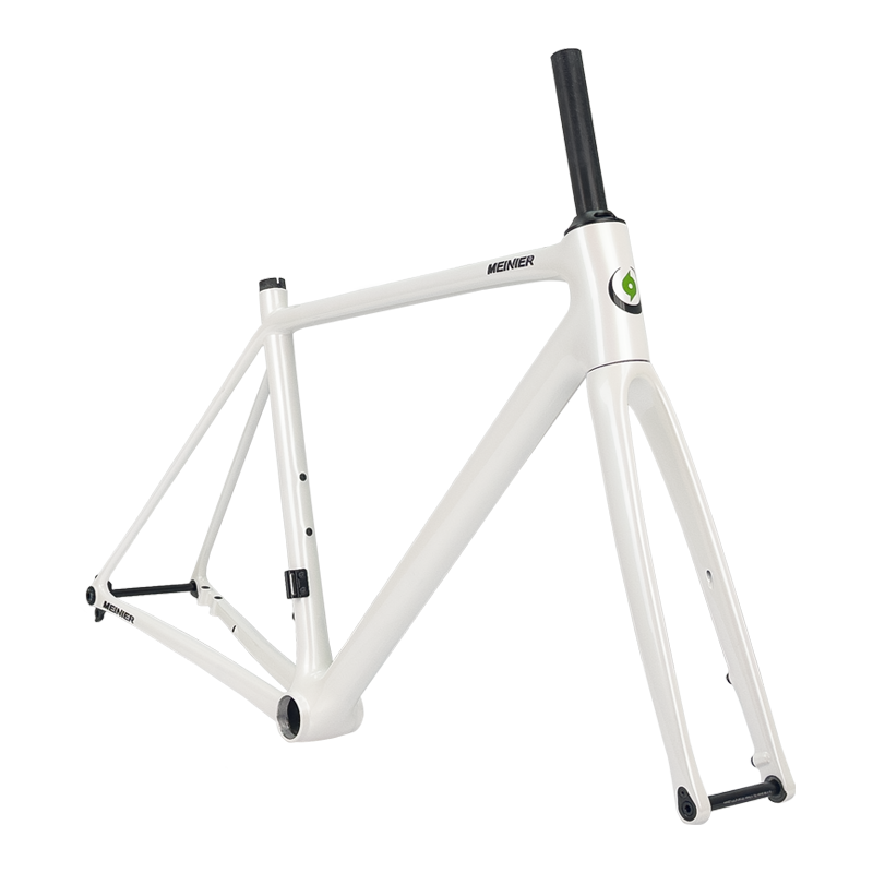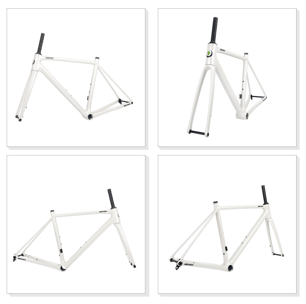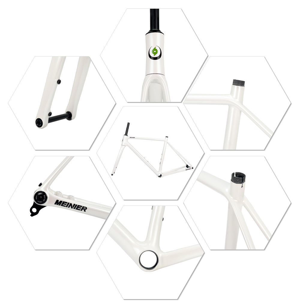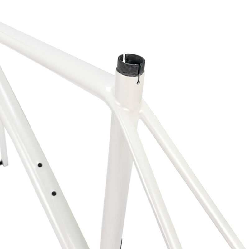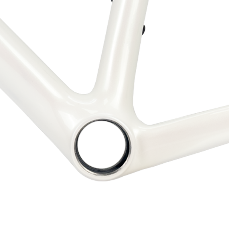 This carbon road frameset, finished in a striking pearl white paint, stands out on the road, showcasing meticulous attention to aesthetic details and highlighting its superior quality. The glossy finish not only delivers a visual impact but also reflects its sophisticated internal engineering – every curve and connection point has been carefully optimized.