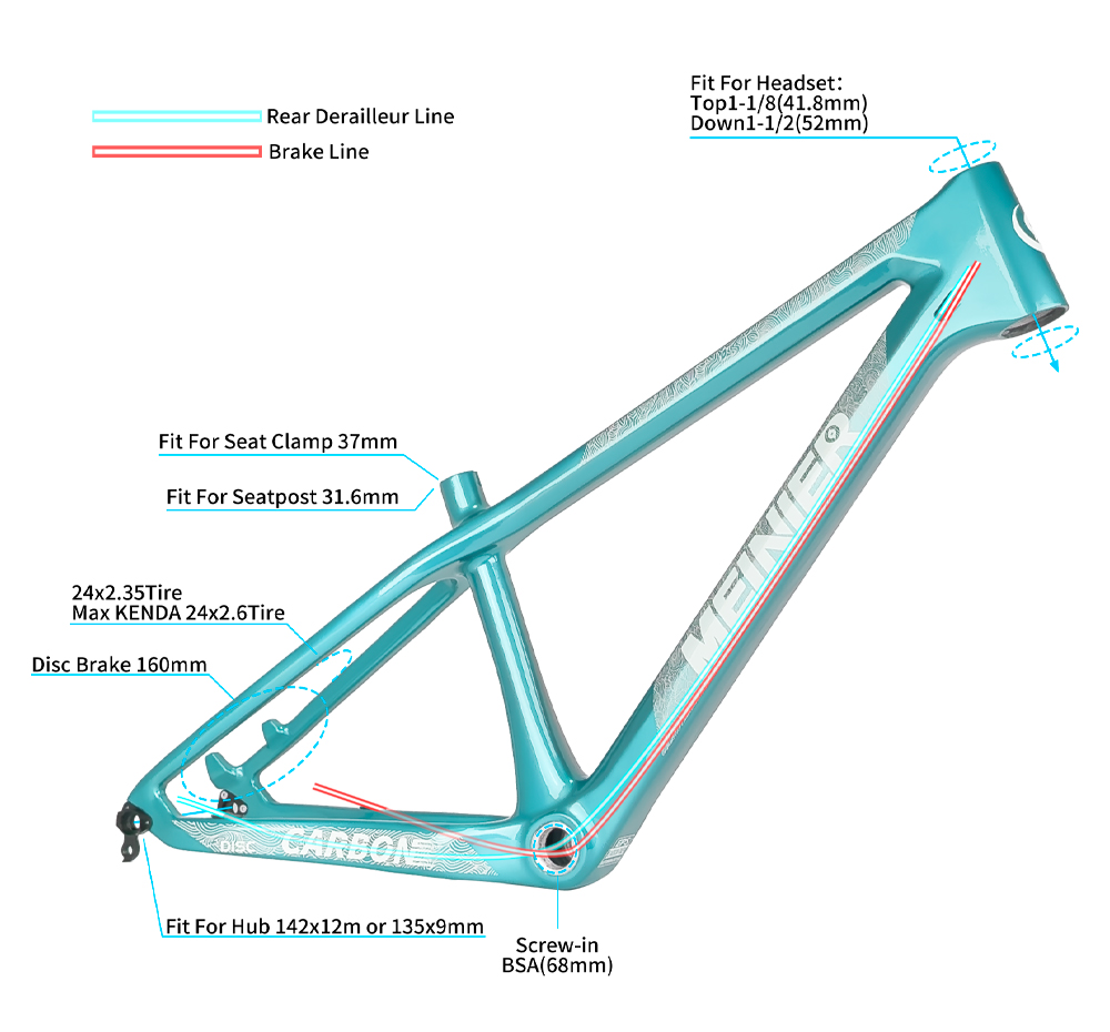 This 24 Inch MTB bike frame for Kids Bike Max 2.35Tire 142x12mm disc brake mountain bike frame lightweight T1000 carbon fiber 24-inch frame for young mountain bikers. Supports 2.35-inch tires, , 31.6mm seat post, 37mm seat clamp, BSA 68mm bottom bracket, and 80-100mm fork travel. Features internal cable routing and lightweight construction for responsive trail performance with minimal fatigue.