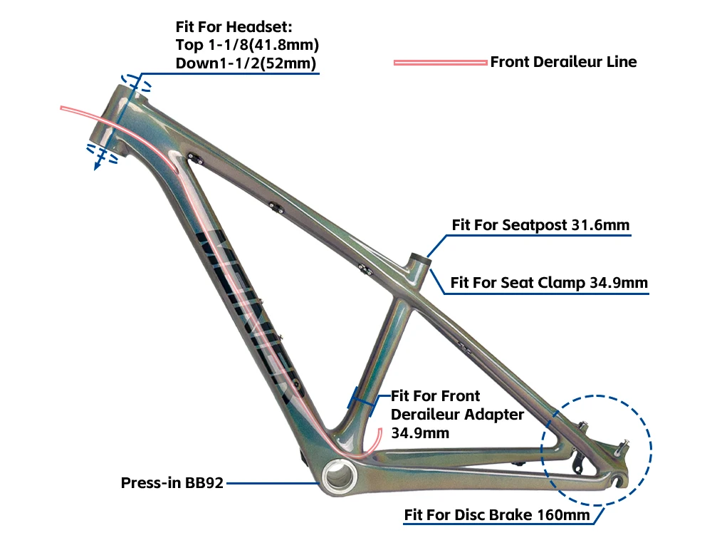 This expertly engineered 26-inch hardtail mountain bike carbon frame provides comprehensive specifications for young trail riders. The 14-inch frame size works with a 31.6mm seatpost diameter for reliable seat tube connection. The tapered headset geometry (1-1/8" top / 1-1/2" bottom) delivers precise steering control and optimal fork integration. BB92 bottom bracket technology maximizes bearing support and minimizes lateral movement during pedaling. The 160mm disc brake standard offers superior stopping power and modulation on technical terrain. Rear hub spacing of 135x9mm ensures standard component compatibility, while 2.35-inch tire clearance expands traction options across varied conditions. Built from T1000 carbon fiber, this carbon bicycle frame achieves exceptional strength-to-weight efficiency, delivering the responsiveness and durability required for progressive skill development and confident trail performance.