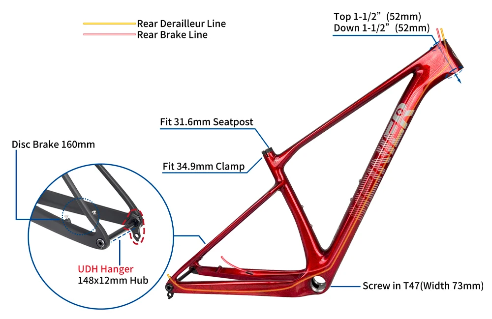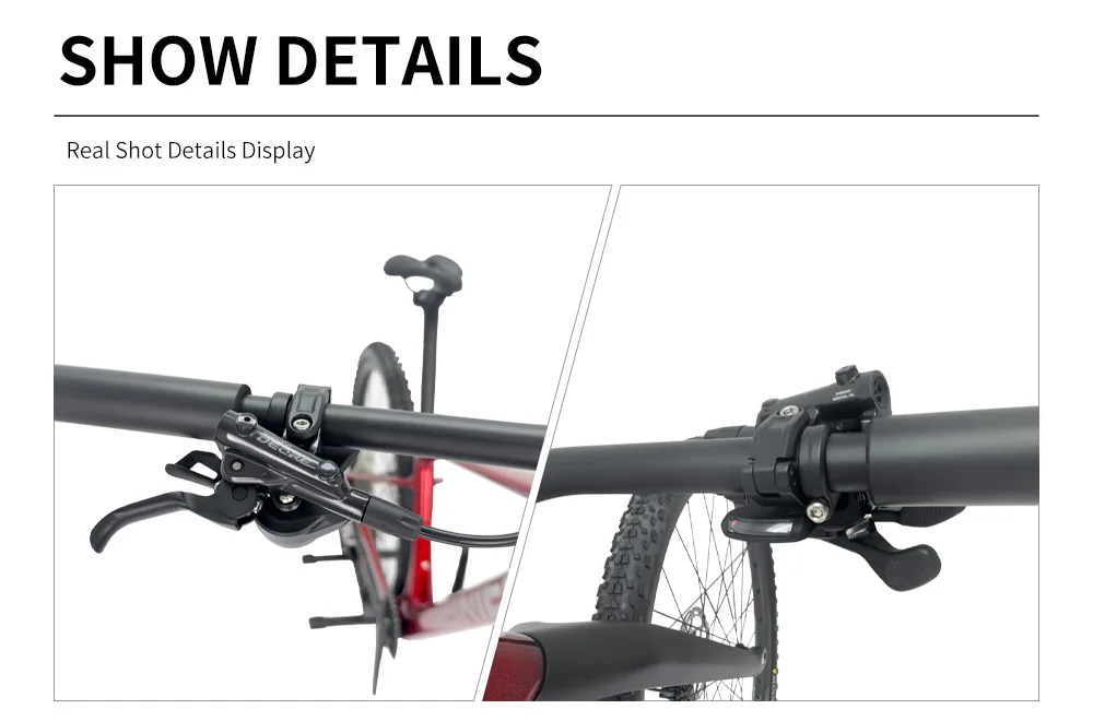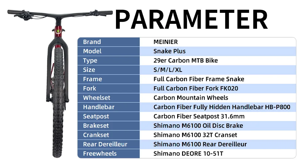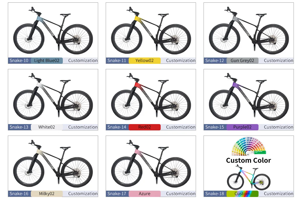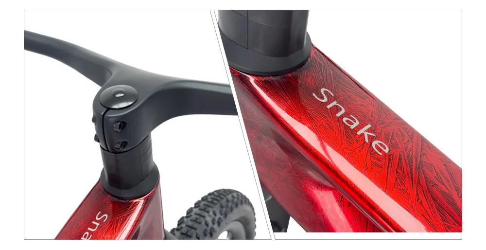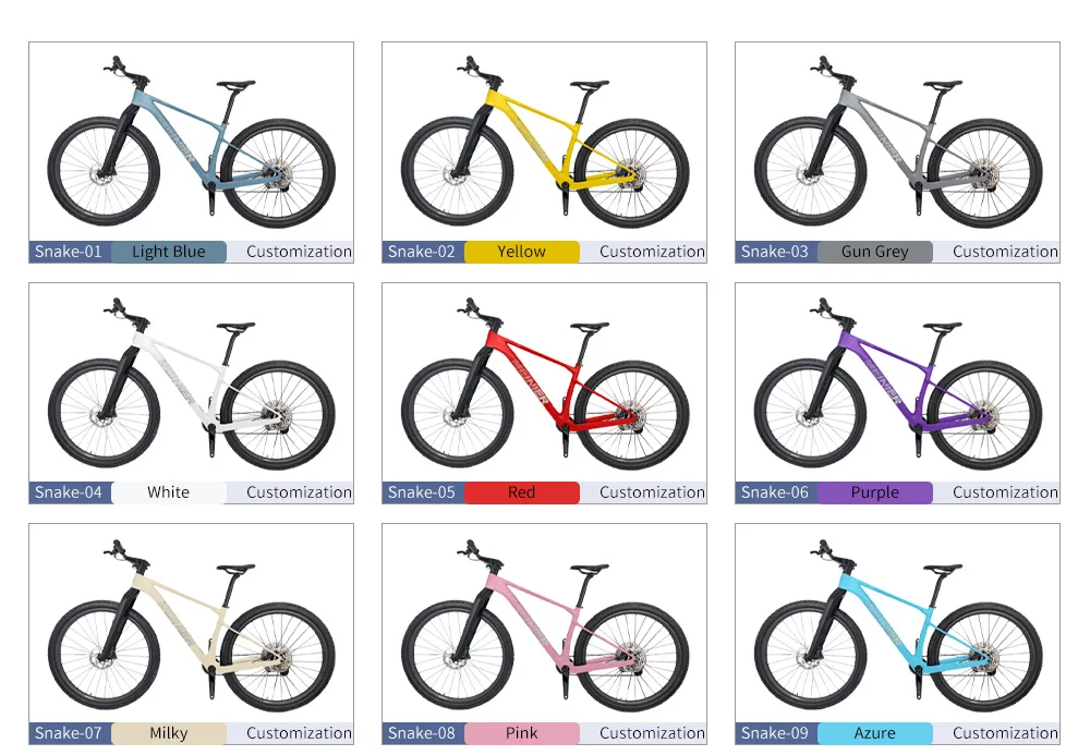 Engineered for serious trail riders, this 29er carbon hardtail represents the pinnacle of lightweight performance and technical capability. The Snake frame geometry has earned its reputation through proven real-world performance, offering an optimal balance between climbing efficiency and descending control. Every component works in concert to deliver a responsive, confidence-inspiring ride across challenging terrain. The fully integrated handlebar design represents a significant advancement in modern bike engineering. By concealing cable routing and brake lines within the frame structure, this approach reduces weight, improves aerodynamics, and creates a cleaner aesthetic that reflects the bike's performance-focused philosophy. The result is a machine that looks as refined as it performs. Shimano M6100 12-speed drivetrain provides the versatility needed for varied trail conditions, with smooth engagement and reliable shifting under load. The complete carbon fiber construction minimizes rotational mass while maximizing frame stiffness—critical factors for precise handling and efficient power transfer. The 29-inch wheels roll with momentum-preserving efficiency, rolling over obstacles with authority while maintaining traction. This hardtail eliminates suspension complexity, rewarding skilled riders with direct feedback and unfiltered connection to the trail. The geometry promotes an intuitive riding position that reduces fatigue during marathon sessions. Built for riders who prioritize efficiency, control, and the pure joy of hardtail riding, this bike delivers uncompromising performance.