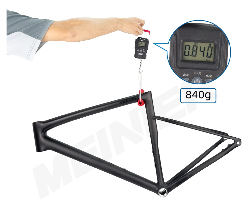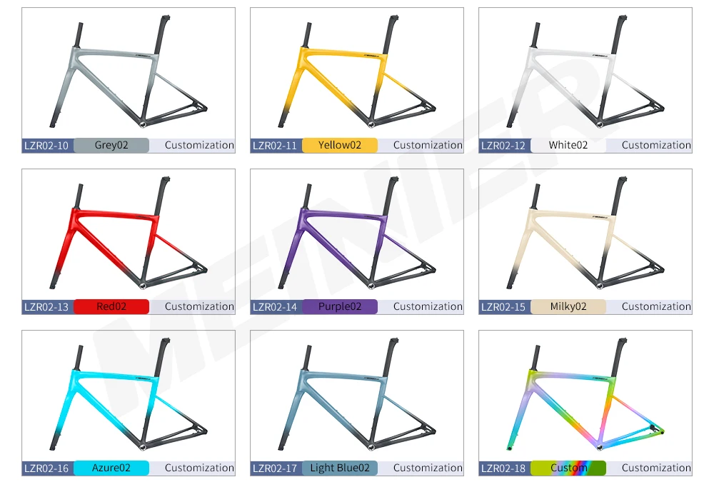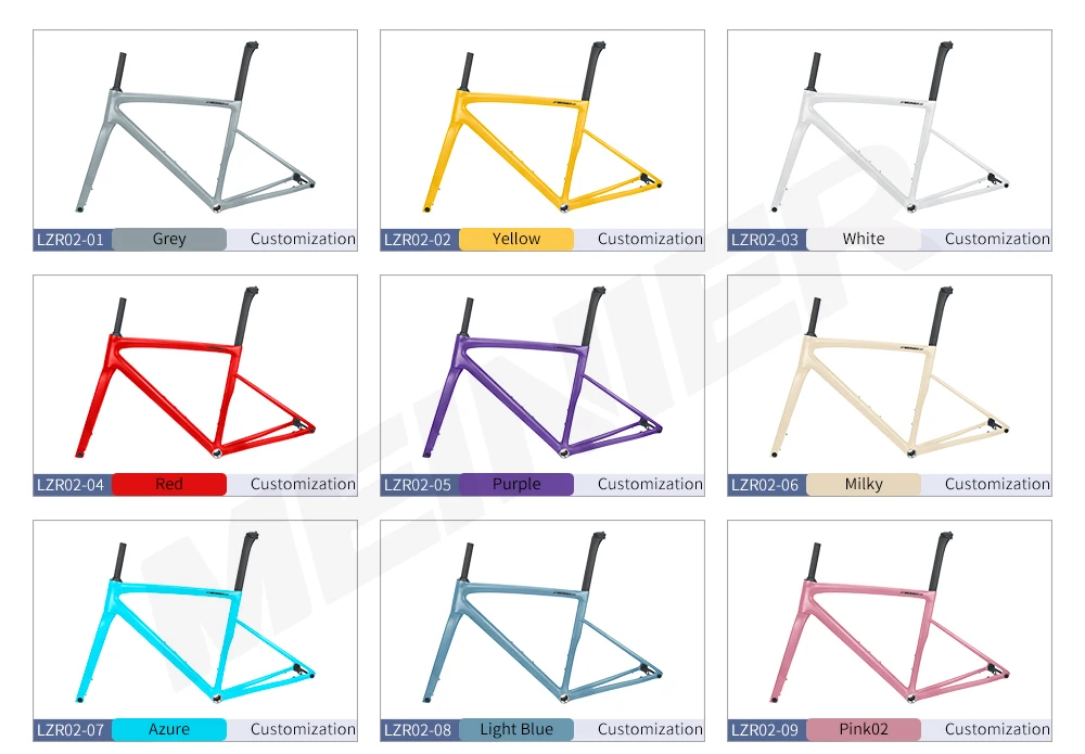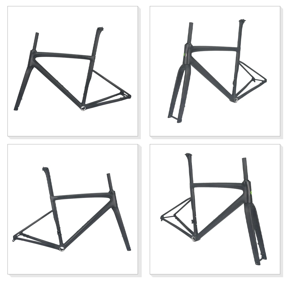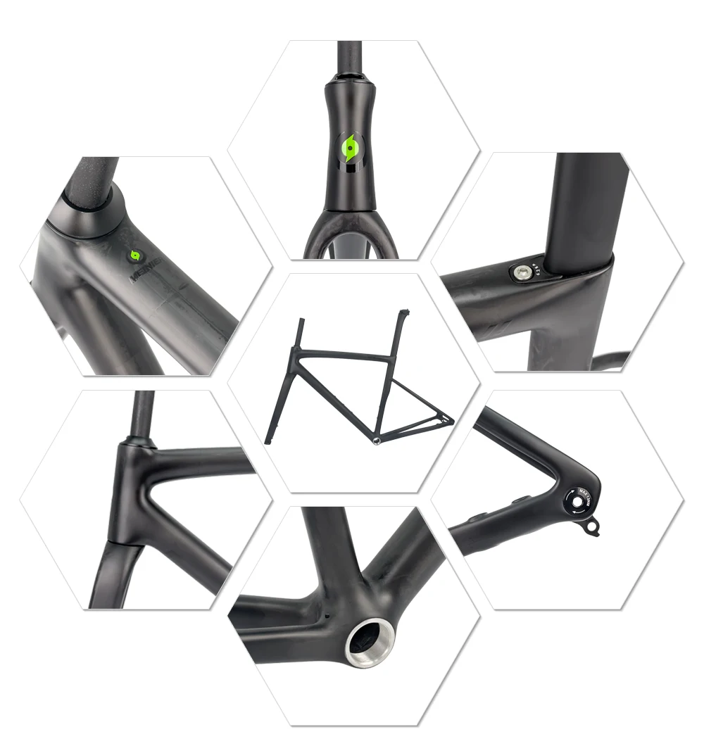 This racing-grade carbon fiber road bike frame features a seamless unibody construction and internal cable routing, achieving sleek lines and optimized aerodynamics. Utilizing high-strength carbon fiber, its lightweight design maximizes the efficiency of every gram of weight. A BSA bottom bracket paired with a UDH rear derailleur system ensures precise power delivery and reliable shifting. The road bicycle frame 142x12mm rear axle provides exceptional lateral stiffness, maintaining stability during sprints and cornering. Disc brake connectors integrate powerful braking force while maintaining a lightweight design. Internal cable routing not only enhances the bike's aesthetics but also effectively reduces wind resistance. Carefully tuned geometry balances climbing efficiency, acceleration, and descent control, making it ideal for professional racing riders.