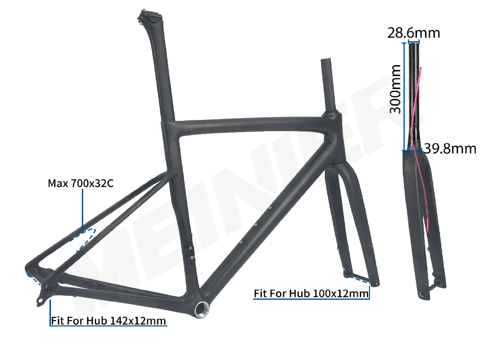 Experience uncompromised speed and precision with this advanced carbon road bike frame engineered for competitive racing. Built from premium carbon fiber, the lightweight construction delivers exceptional power transfer and responsiveness on every sprint. The UDH (Universal Derailleur Hanger) system ensures compatibility with modern drivetrains while maintaining frame integrity. Accommodating up to 32C tires, this 700C frame balances aerodynamic efficiency with versatile terrain capability. Integrated disc brake mounts provide superior stopping power and modulation for confident descents. Purpose-built for cyclists demanding high-performance equipment that translates effort into results.