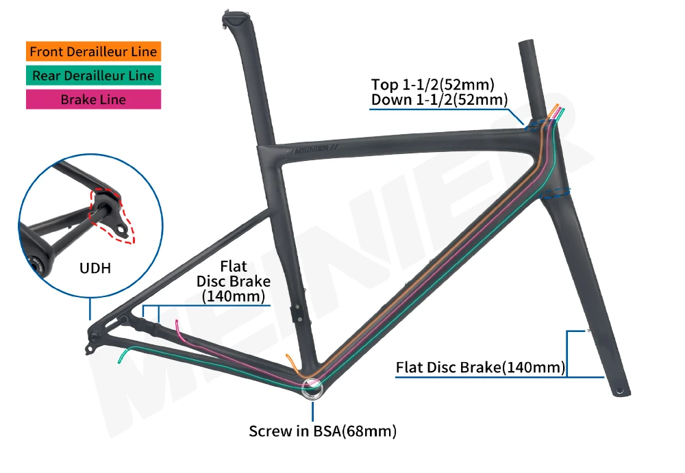 Advanced carbon road frameset equipped with modern UDH rear derailleur hanger technology, delivering superior drivetrain precision and compatibility with current groupset standards. The UDH interface provides enhanced alignment accuracy and improved shifting responsiveness across the cassette range. BSA threaded bottom bracket ensures consistent power delivery and mechanical reliability. The carbon frameset 142x12mm thru-axle design maximizes lateral rigidity for explosive sprint performance and stable cornering dynamics. Disc brake ready for integrated stopping power without compromising frame weight. Meticulously crafted geometry balances aerodynamic efficiency with responsive handling characteristics. Every component detail—from the UDH hanger specification to tube construction—reflects professional-grade engineering for serious competitive cyclists.