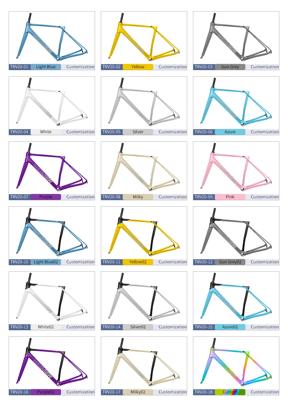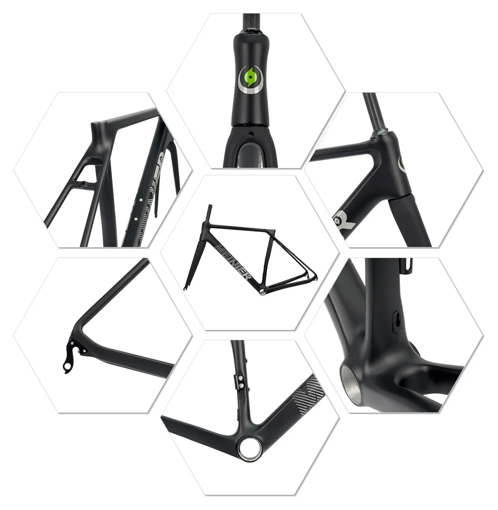 This carbon fiber road bike frame's V-brake compatible design offers riders a wide range of modification potential. The standardized V-brake mounting interface allows for flexible selection of brake components from different brands and sizes to meet individual performance needs. Whether upgrading to high-end racing brakes or opting for a cost-effective mechanical system, the frame structure fully supports it. The 130x9mm rear axle spacing and 100x9mm front axle spacing follow industry standards, ensuring compatibility with various wheelsets and drivetrains. The T47 threaded bottom bracket and 1-1/2" head tube design also use universal specifications, allowing riders to freely customize core components such as cranks and headsets. This modular design philosophy provides long-term upgrade potential, making it suitable for professional riders seeking personalized configurations and continuous improvement.
