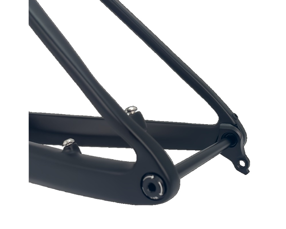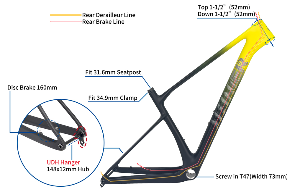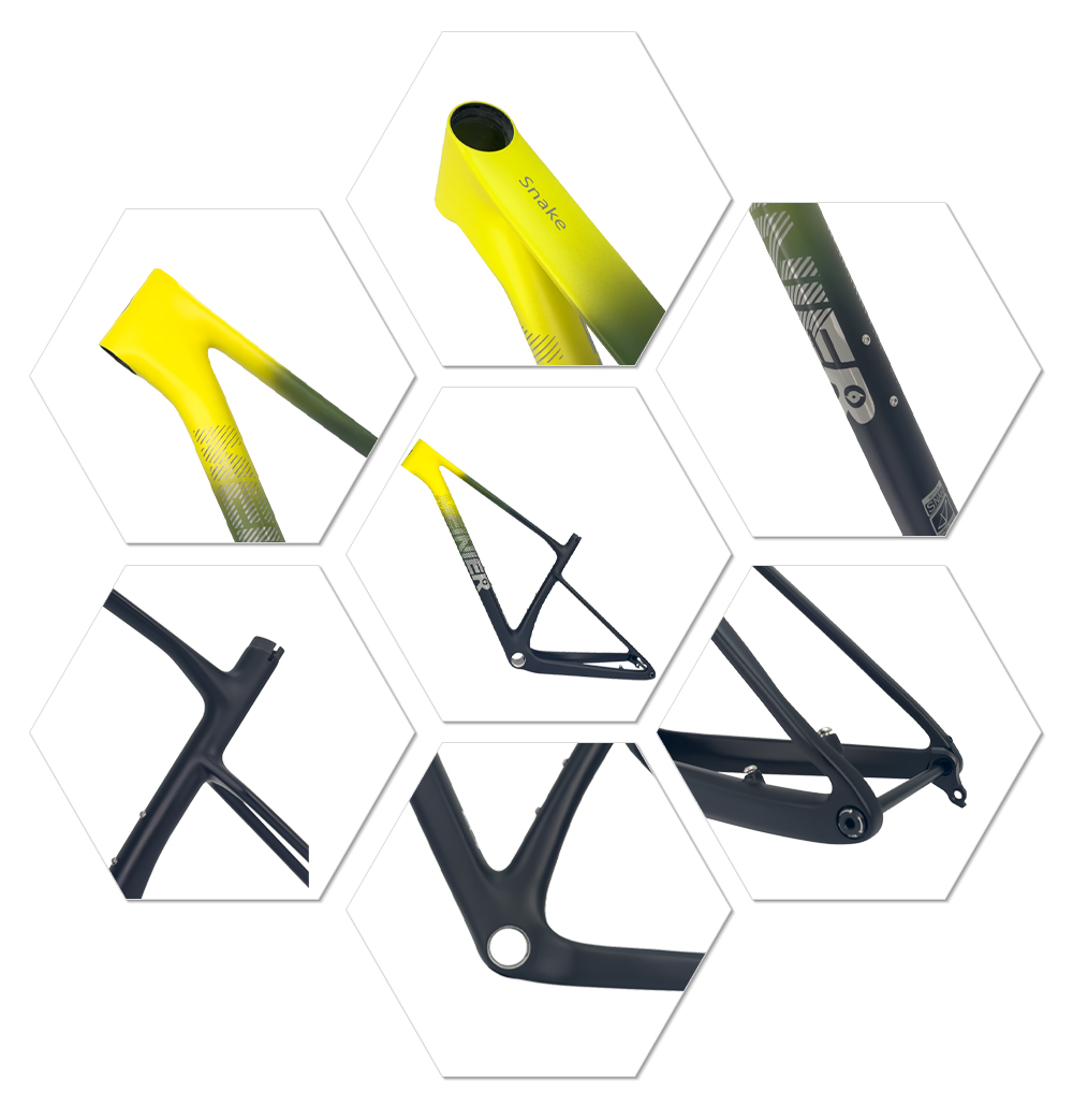 This carbon fiber mtb frame Internal cable routing conceals the cable housing, giving the MTB frame a cleaner and tidier look and reducing the clutter of exposed cables. Protected within the frame, the cables are protected from external elements such as dirt, sand, and rocks, extending their lifespan. Cable routing also reduces aerodynamic drag, making the mountain bike smoother at high speeds and enhancing overall performance.